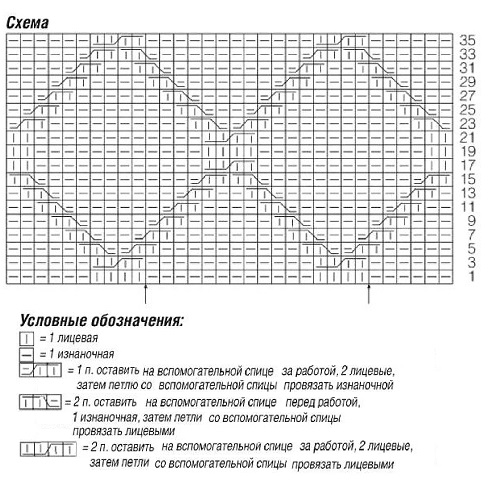 Продолжить работу на спицах № 5,5 узором 2, при этом в 1-м р. равномерно прибавить 0 (2) 0 п. = 48 (50) 52 п.