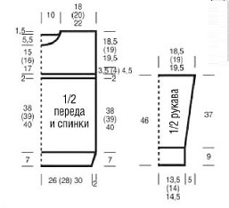 Вязать, как спинку, но для более глубокой горловины уже через 55 см = 138 р. (57 см = 142 р.) 59 см = 148 р. от нижней планки закрыть средние 18 п. и обе стороны закончить раздельно.